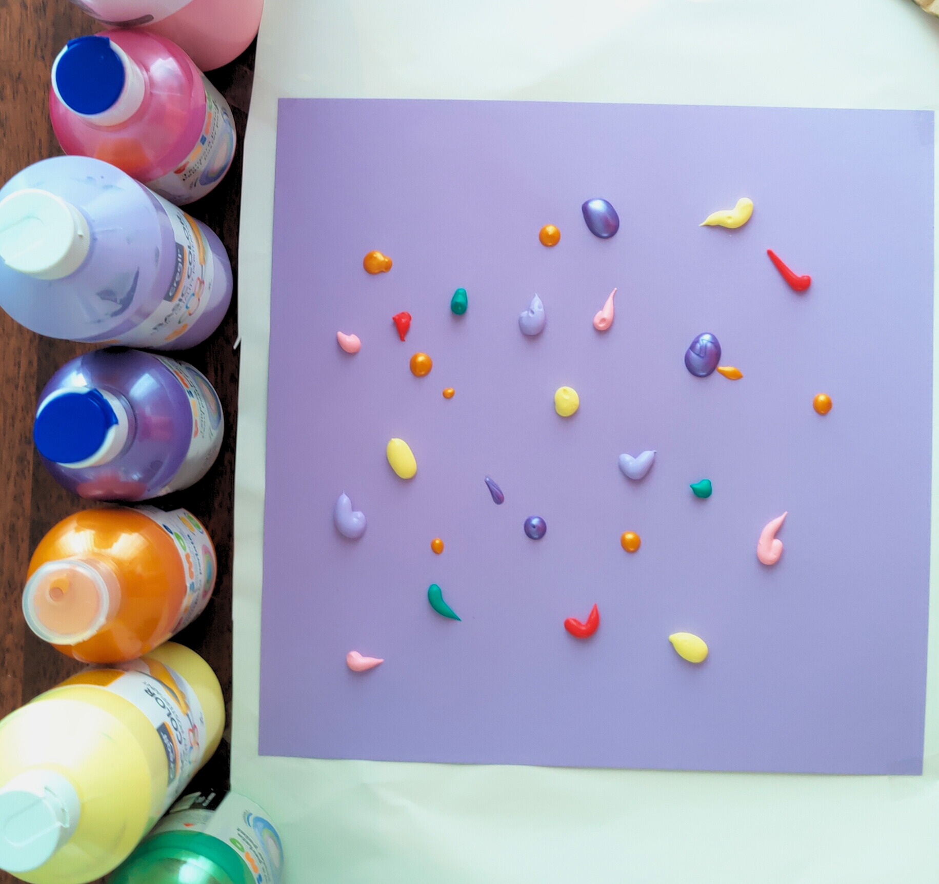 • Neem verschillende kleuren verf en plaats kleine stippen op het karton.